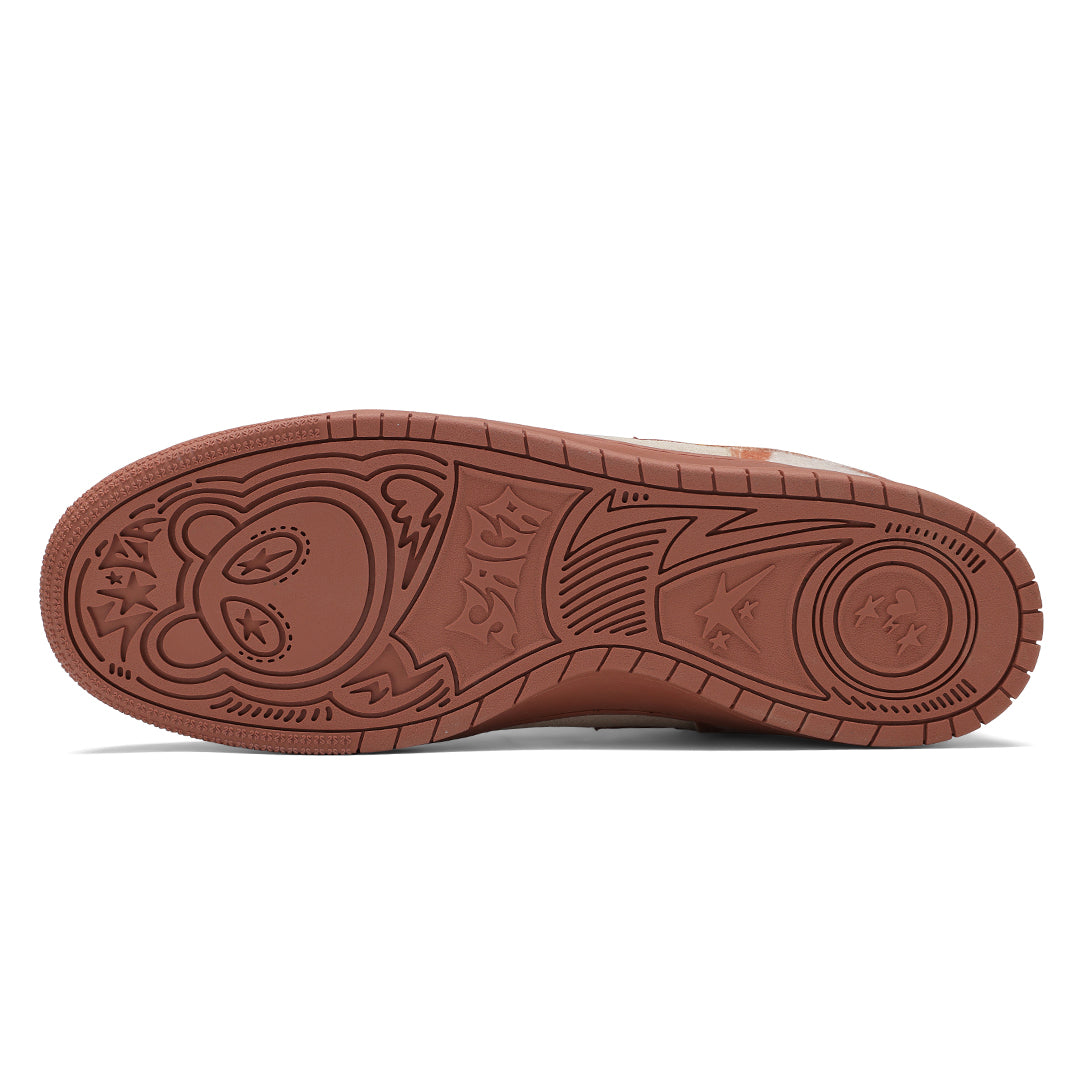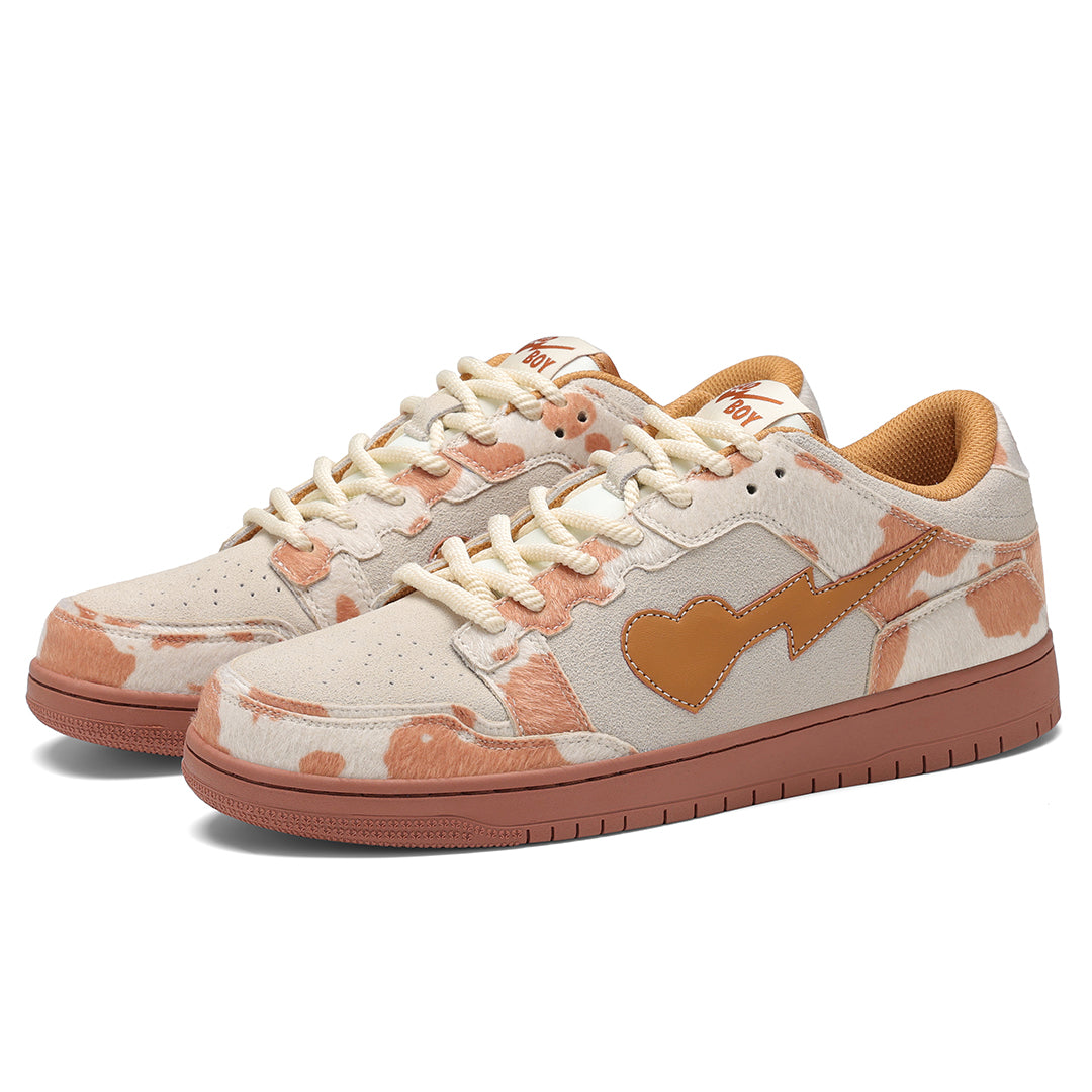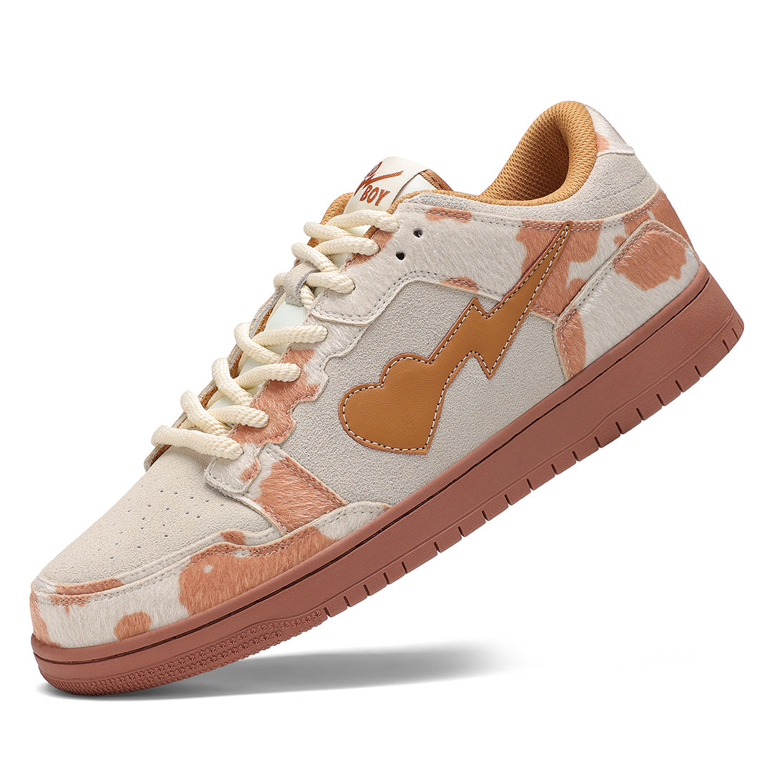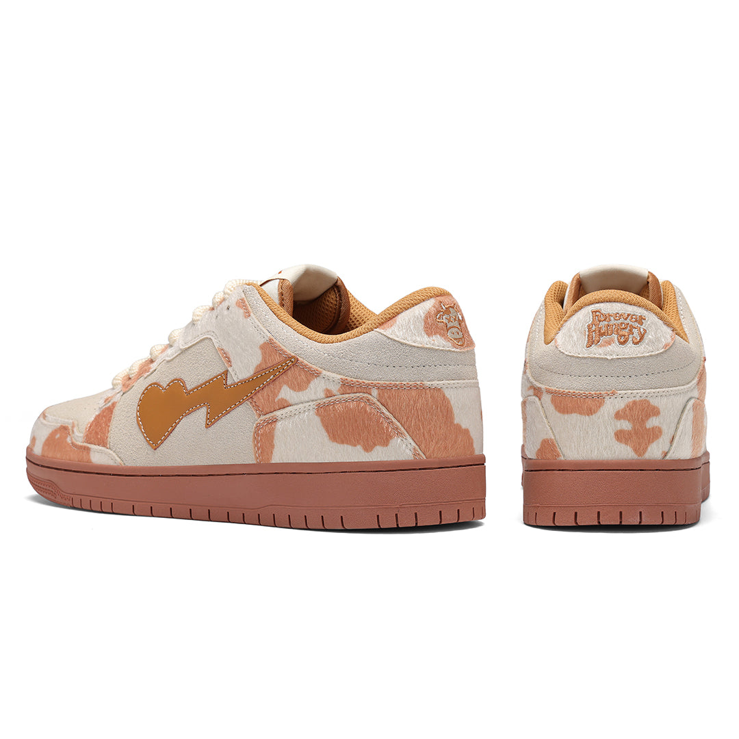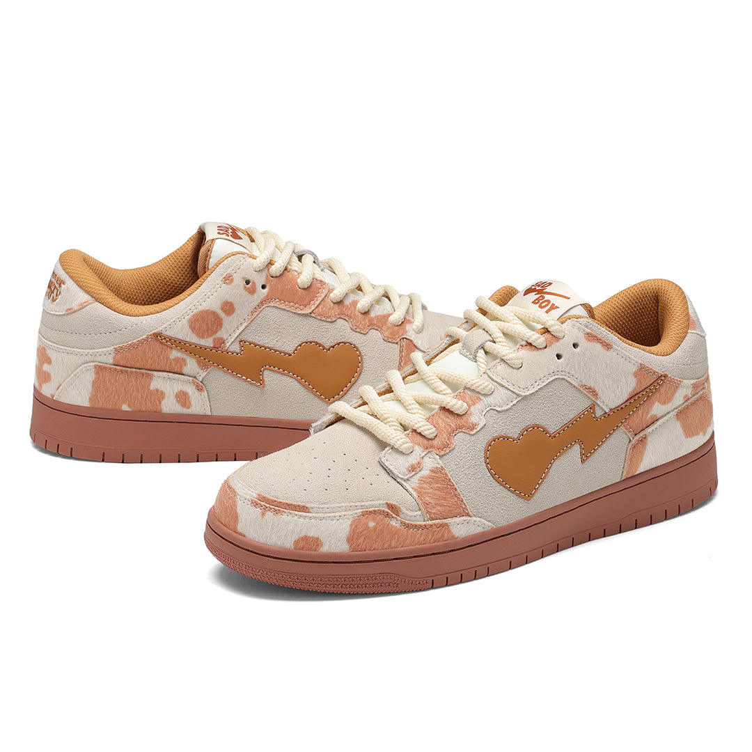 Cocoa-toned suede while accented with pony-hair overlays rendered in a spotted cow print. A brown leather Heart Bolt is treated to a premium leather. The back of the shoe features velcro detachable logos.