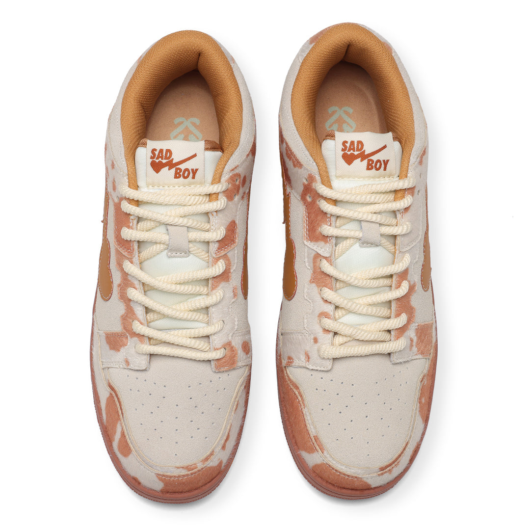 This shoe is composed of a cream-colored suede while accented with pony-hair overlays rendered in a spotted cow print. A pink leather heart bolt is treated to a premium leather while the outsole features an industrial grade rubber.